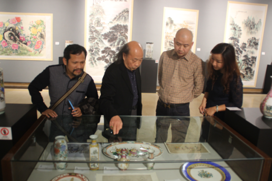 劉致遠(yuǎn)作為國(guó)畫、廣彩陶藝大師劉群興之子,也自幼隨父學(xué)習(xí)國(guó)畫及陶瓷制作,其廣彩作品色澤鮮明,絢麗多彩,既師吸收統(tǒng)繪畫技法,又仿造西洋畫法,頗具嶺南畫派折衷中西的精髓。其國(guó)畫松樹題材的創(chuàng)作,盡顯崇山峻嶺之中,松之勁峭與水之嫵媚,其繪制的山水題材彩瓷既有山河磅礴之態(tài)勢(shì)、又具匠心細(xì)刻之精致。此次兩位嶺南畫派傳承人在此展出他們的作品,內(nèi)容、風(fēng)格各異,交相輝映,很好地承傳了嶺南畫派的要義。