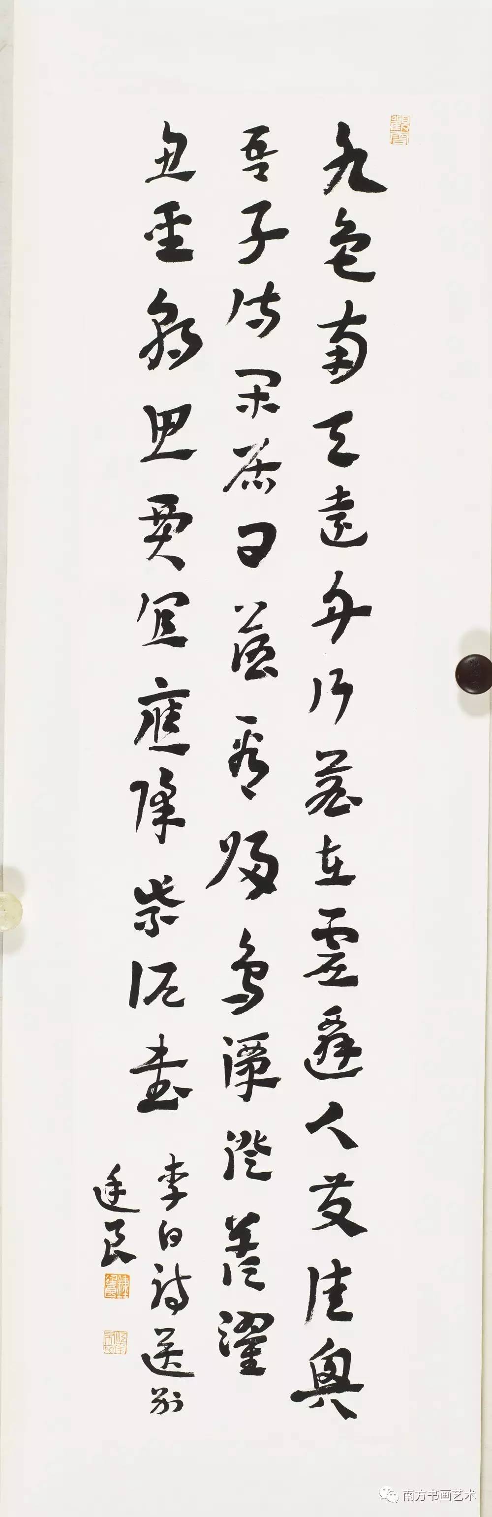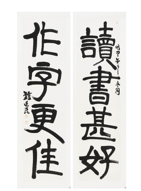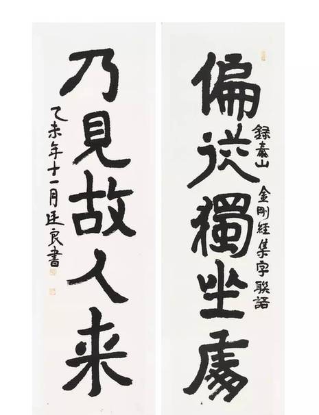 鐘廷良學書的過程離不開他的收藏,也得益于他的收藏!2011年收得清代書壇巨匠伊秉綬一副對聯(lián)后,細細研摩臨寫。此后,也有所悟所得。2012年收得民國舊拓“泰山金剛經”集聯(lián)后,對泰山金剛經刻石奉為至尊,敬若神明。爾后,凡作大字,皆以其為架構,而其書也漸有可觀者。由于長期從事文字工作之關系。讀書,亦成了鐘廷良生活的一部分。其深知唯有讀書方能為書法注入養(yǎng)分。唯有知識方能豐富書法內涵。鐘廷良的書法,尊崇于中國傳統(tǒng)文化所倡導的書論和畫理。在學習古人、先賢經典的基礎上,小心求索,認真創(chuàng)作。既注重以古為師,又融匯時代精神,孜孜不倦,其書漸入佳境。