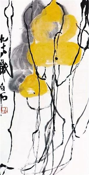 齊白石的《葫蘆》,被稱為是齊白石的絕筆,據(jù)說當(dāng)時(shí)齊白石為了畫這幅畫,一天早晨起來,沒有人攙扶,他自己從臥室踉踉蹌蹌地走進(jìn)畫室,站在桌前,擼起袖子,畫下了這一幅畫。據(jù)畫家李可染回憶,當(dāng)時(shí)的齊白石已經(jīng)是老糊涂了,“九”字不知道該怎么寫,到了“歲”就直接寫錯(cuò)了,只能夠憑自己的直覺畫畫,即便是畫了一輩子的畫,但是到最后由于體力和腦力的不支,實(shí)在是畫不出來了。齊白石一開始用黃墨去畫葫蘆,畫下正確的一筆,一大一小,一前一后,一上一下。但當(dāng)他接著去畫葉子的時(shí)候出錯(cuò)了,把葉子順即也畫成了葫蘆,且葫蘆留白處冒出兩筆淡墨,就好像葫蘆被打了兩個(gè)洞。當(dāng)畫藤蔓時(shí),又恍惚了,畫著畫著又成葫蘆了。齊白石老人在做這幅畫時(shí)已經(jīng)是精力透支了,能畫出樣子來已經(jīng)實(shí)屬不易了,但是我們可以看到,其實(shí)齊老畫的這幅畫是別有一番風(fēng)韻在的,比如說他畫的藤蔓,這藤蔓真是絕了,能夠在不知不覺中畫出葫蘆的成熟、滄桑,把經(jīng)過風(fēng)吹雨打后形成的那種彎曲,表現(xiàn)得淋漓盡致。