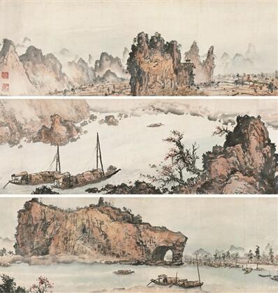 關(guān)于長(zhǎng)卷《漓江百里圖》。他意味深長(zhǎng)地回顧說:“是年秋我從韶關(guān)到了桂林,得阮退之推薦,認(rèn)識(shí)李焰生,經(jīng)其介紹,住進(jìn)七星巖公寓舊房子,家具十分簡(jiǎn)陋,只有一張二尺多長(zhǎng),一尺多寬的小桌子,勉強(qiáng)可以畫些小品之類,根本無法展開畫大幅。我欠房東錢,他幫我擔(dān)保,后又被邀住進(jìn)其家。幸得可以在其家廳中的八仙桌上作畫,而作長(zhǎng)卷則只好蹲或趴在地下屈就。我日夜不停,苦戰(zhàn)了近兩月,終于完成《漓江百里圖》。我將其放在桂林的第一次畫展中展出。畫展結(jié)束,我把小幅畫出賣,權(quán)作生活費(fèi)。但此長(zhǎng)卷則隨身攜帶。1942年在四川樂山展出時(shí),武漢大學(xué)教授吳其昌先生觀后扶病題跋。1980年我請(qǐng)榮寶齋張貴桐老師傅將長(zhǎng)卷和題跋精裱,合二而一,永存紀(jì)念。”可見關(guān)老對(duì)此長(zhǎng)卷之珍愛!