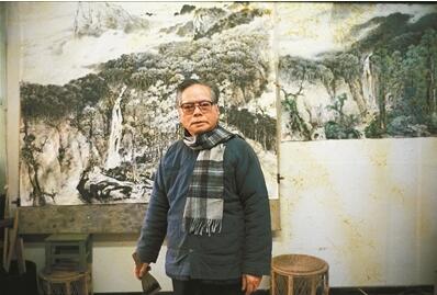 1983年,關山月在創(chuàng)作的《碧浪涌南天》前留影。