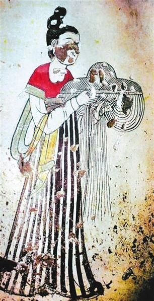那么,唐初流行了幾十年的“羃”是什么樣子?從文獻記載看,它的特點是“全身障蔽”?!杜f唐書·李密傳》記載李密投降唐朝后再次反叛,帶領上千士兵,化妝成女性,戴羃,羃內(nèi)藏刀,到縣城后,變裝持刀殺出,占領了縣城。我們可以設想一下,上千“女性”穿戴著羃在道路上行走,路人不僅不以為怪,而且不知是士兵,可見“羃”的流行,以及遮蔽之嚴??上У氖牵壳皬奈奈镔Y料中還找不到“羃”的確切形象。1990年,在盜掘后的唐太宗燕妃墓壁畫中,有一幅被考古工作者定名為“捧羃女侍圖”,似乎仕女捧的是“羃”。