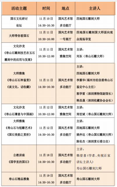 不僅如此,來自四地的國(guó)家級(jí)、省級(jí)工藝美術(shù)大師、非物質(zhì)文化遺產(chǎn)傳人將親臨深圳, 展覽期間,舉辦名家對(duì)話論壇,開設(shè)兩場(chǎng)名石雕刻藝術(shù)公開講座,另逢周末將特邀兩位國(guó)石大師在現(xiàn)場(chǎng)為觀眾導(dǎo)賞。