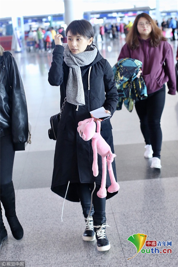 2017年12月10日,北京,王子文現身機場,裹圍巾羞澀撓頭,少女感十足,提溜粉絲所贈“粉紅豹”童心未泯。