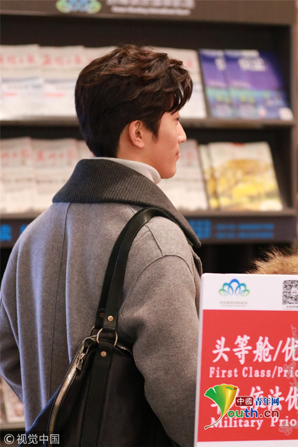 2017年12月11日,無錫,竇驍灰大衣帥氣現(xiàn)身無錫機(jī)場,見攝影師拍圖隔著玻璃比V,暖男無疑了!
