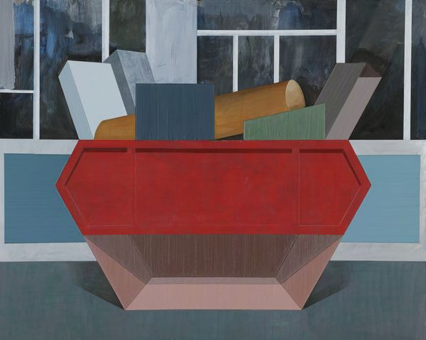 趙新宇作品當(dāng)中的圖式來(lái)源,無(wú)論是從攝影作品中或者裝置作品中抑或現(xiàn)實(shí)當(dāng)中選取某個(gè)場(chǎng)景的邊角,從某種程度上,均服從于他個(gè)人基于謹(jǐn)慎的、甚至敏感的內(nèi)在壓制,正如《室外2#容器》背景的窗框,稱其為窗框,倒不如把它當(dāng)作畫面整體結(jié)構(gòu)的一個(gè)同級(jí)邏輯走向,正如同置放在背景前的所謂“容器”當(dāng)中的幾何體,是幾何化了的現(xiàn)實(shí)物與根據(jù)畫面再行部分添加的合奏,在某種程度上,也可以說(shuō)是塞尚繪畫理念的一則變異體。