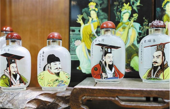 談及創(chuàng)作過程,楊藝說,鼻煙壺內(nèi)畫的制作,一般是在水晶壺或素玻璃壺內(nèi)壁,用特制的細(xì)筆,蘸取少許墨汁顏料,從小口中深入瓶中,反手作畫。創(chuàng)作內(nèi)畫,在常人看來,不可思議之處是有限的空間以及需要反手作畫,這也是每一個(gè)內(nèi)畫師面臨的主要難題所在,“創(chuàng)作內(nèi)畫時(shí),需要在這盈寸天地間做到手指和筆桿揮灑自如,這極其考驗(yàn)一個(gè)人的耐性。一手執(zhí)壺,一手作畫,作畫時(shí)需要在壺內(nèi)反手描繪,如此,才能讓人們在外部看到正面的畫像結(jié)構(gòu)?!眱?nèi)畫的難度還在于,要長期低頭畫畫,因此還導(dǎo)致頸椎疼痛,中途為了治療疼痛休畫了好長一段時(shí)間。