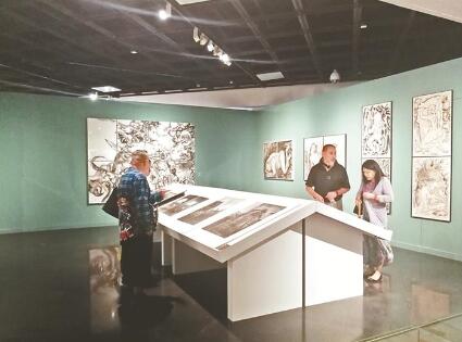 選擇“造藝之書”作為展覽的主題,是以 “技藝與方法”即技與道為一的中國藝術(shù)精神來回應當下數(shù)字時代的挑戰(zhàn)。展覽由中國文聯(lián)副主席、中國美協(xié)副主席、中國美術(shù)學院院長許江教授領銜,組成了多畫種、老中青結(jié)合的創(chuàng)作團隊。記者在現(xiàn)場看到,展覽的一大板塊,是版畫系近幾年來“藝術(shù)家書”課程的教學科研成果。大、中、小三種不同格式的“藝術(shù)家書”,共計作品100件有余,內(nèi)容豐富,材料、形式語言多樣。尤其值得一提的是,此次展覽還包括了2016年完成的中華文明重大歷史創(chuàng)作工程項目《天工開物》版畫長卷。