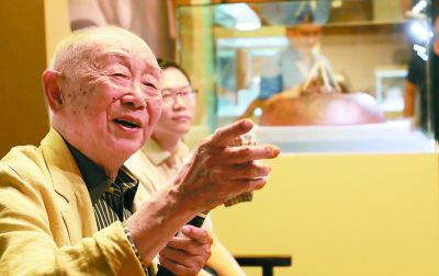 此次展覽作品以紫砂壺體為載體,借助紫砂鐫刻工藝半繪半刻,是黃永玉在創(chuàng)作媒材上又一次新的嘗試。作為書畫界有名的“90后”老頑童,在展覽開幕式上,黃永玉雖然耳朵有點(diǎn)背,但依然“金句”頻出,話里透著天真幽默:“一個老頭閑在家里沒事兒干,畫了一些壺。用時髦的話來講,就是行為藝術(shù)吧!”