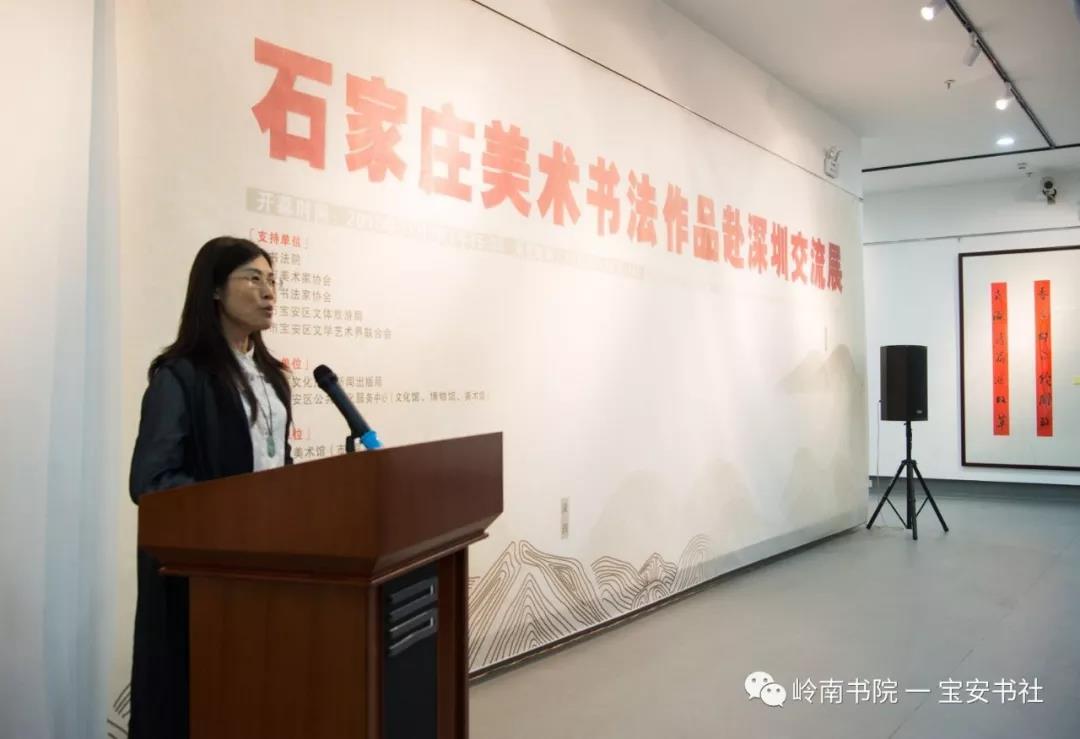 2018年11月8日下午15:00,由石家莊市文化廣電新聞出版局、深圳市寶安區(qū)公共文化服務(wù)中心(文化館、博物館、美術(shù)館)主辦,石家莊市美術(shù)館(市畫院)、嶺南書院、深圳寶安書法藝術(shù)研究社承辦,深圳市寶安區(qū)圖書館、寶安區(qū)美協(xié)、寶安區(qū)書協(xié)協(xié)辦并得到深圳市書法家協(xié)會、美術(shù)家協(xié)會、寶安區(qū)文體旅游局、寶安區(qū)文聯(lián)的大力支的 “ 石家莊美術(shù)書法作品赴深圳交流展 ” 在深圳市寶安區(qū)圖書館負(fù)一樓展廳隆重開幕——