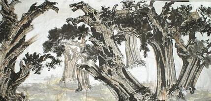 另一個(gè)他擅長(zhǎng)的題材是古柏樹。1992年他去泰山采風(fēng)途中。山上的古柏樹生機(jī)勃發(fā),堅(jiān)韌不拔,給他帶來了一種震撼的力量。他當(dāng)時(shí)就想將這些古柏入畫,為古柏注入精神意義。從此,在孔府、孔林、古蜀道以及陜西等地都留下他觀察古柏的足跡。有評(píng)論家認(rèn)為,他的藝術(shù)作品不但在整體的構(gòu)圖上自然、清新和潤(rùn)朗。而且在整體的布局上,疏密相間,虛實(shí)相融,用獨(dú)有藝術(shù)感覺構(gòu)建出了一個(gè)既蘊(yùn)含了詩(shī)情畫意,又張揚(yáng)了文化魅力和內(nèi)心情感的藝術(shù)空間。