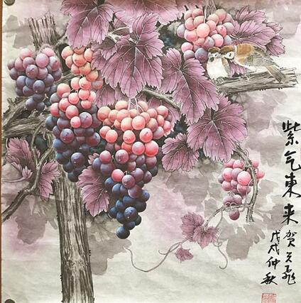 仔細(xì)觀察他筆下的葡萄,那密密實(shí)實(shí)、郁郁蔥蔥的葉子下,葡萄掛滿了架。有的紫紅色,有的青綠色,像瑪瑙,晶瑩剔透的葡萄讓人饞涎欲滴,期間引來雀鳥駐足枝頭,享受著秋收的喜悅和精彩。賀天飛坦言,葡萄題材的創(chuàng)作并非一件易事。在四十多年中,他只畫了九十多幅葡萄圖。一幅斗方的葡萄他通常都要畫上五天到一周。此次展出的作品匯聚了五年來他對(duì)這一題材的創(chuàng)作成果。