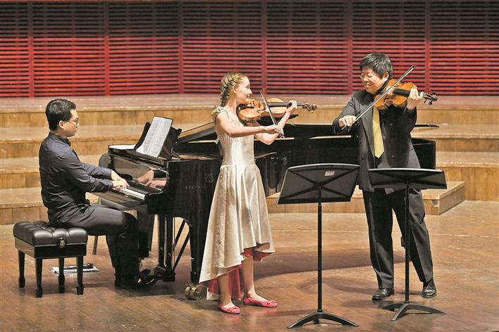在音樂會的上半部分,艾瑪用小提琴和鋼琴演奏巴赫、舒伯特和斯卡拉蒂的名曲,以及她創(chuàng)作的鋼琴奏鳴曲,并聯(lián)手我國中提琴演奏家、教育家白明,青年鋼琴演奏家沈璐和青年女高音歌唱家陳麗安一齊奏響她創(chuàng)作的三重奏、小提琴協(xié)奏曲,以及歌劇《灰姑娘》選段。值得一提的是,歌劇《灰姑娘》是艾瑪10歲時完成的一部長篇歌劇,并在2016年與祖賓·梅塔大師聯(lián)合制作了該作品的完整版,以更為豐滿的面貌在維也納首演,獲得了觀眾起立鼓掌以及來自國際范圍內的好評。