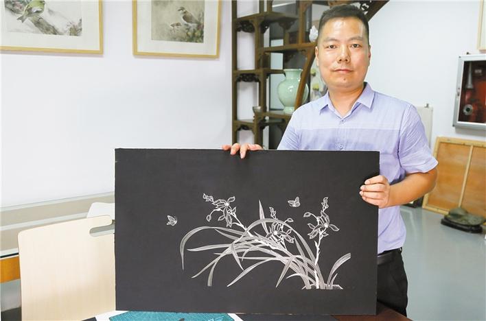 采訪現(xiàn)場(chǎng),何俊剛向記者展示麥金畫的制作過(guò)程。首先是選麥,然后擇優(yōu)挑選,接著刨開、刮平、燙制、分料等,一片片金黃色的麥秸皮就完成了,裝箱備用。隨后,粘貼、書寫、刻制、上色、裝裱再壓光、裝鏡。何俊剛表示,刻制時(shí)既要精神集中,全神貫注,又要心平氣和,一絲不茍,心手合一才能把書寫字或畫稿,刻制而成。