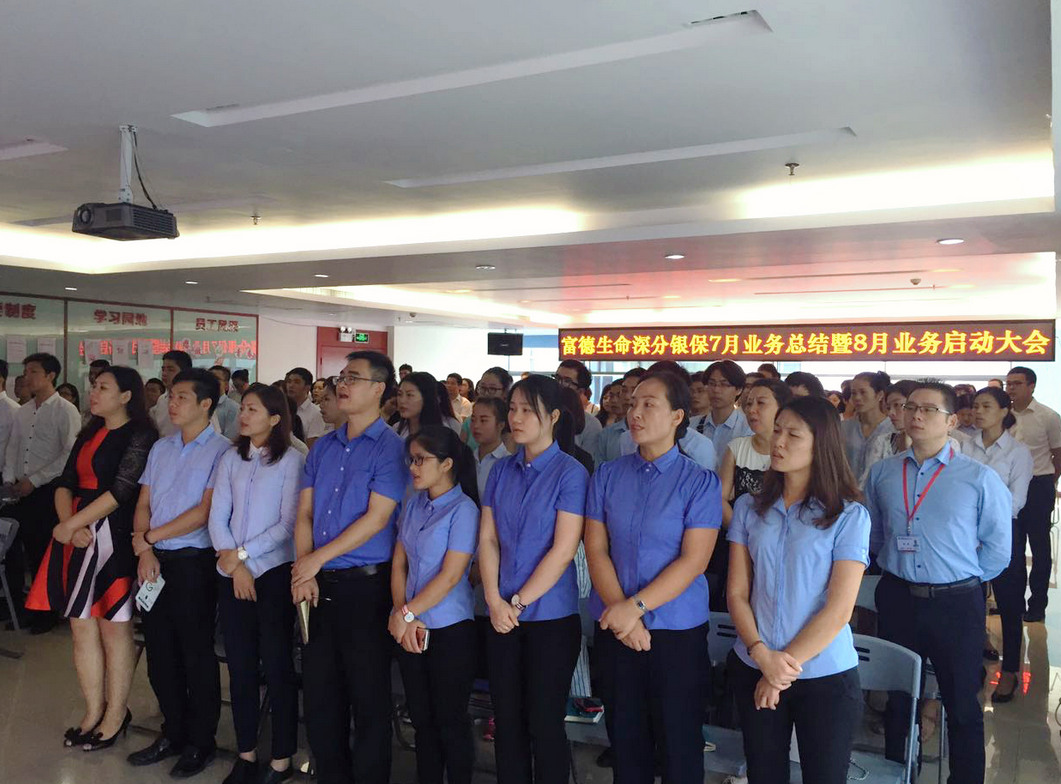 深圳新聞網(wǎng)訊 7月22日,富德生命人壽深圳分公司銀行保險(xiǎn)中心召開銀保中心七月業(yè)務(wù)總結(jié)暨八月業(yè)務(wù)啟動(dòng)大會。分公司總經(jīng)理助理高東亞、銀保中心總監(jiān)任華、各營業(yè)區(qū)總監(jiān)、部經(jīng)理、客戶經(jīng)理及銀保中心全體內(nèi)勤員工出席會議。