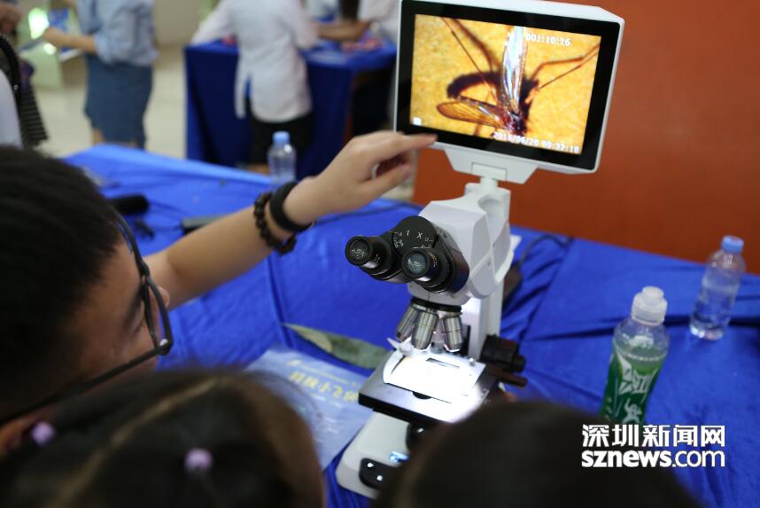 現(xiàn)場(chǎng)孩子們?cè)陲@微鏡下觀察昆蟲
