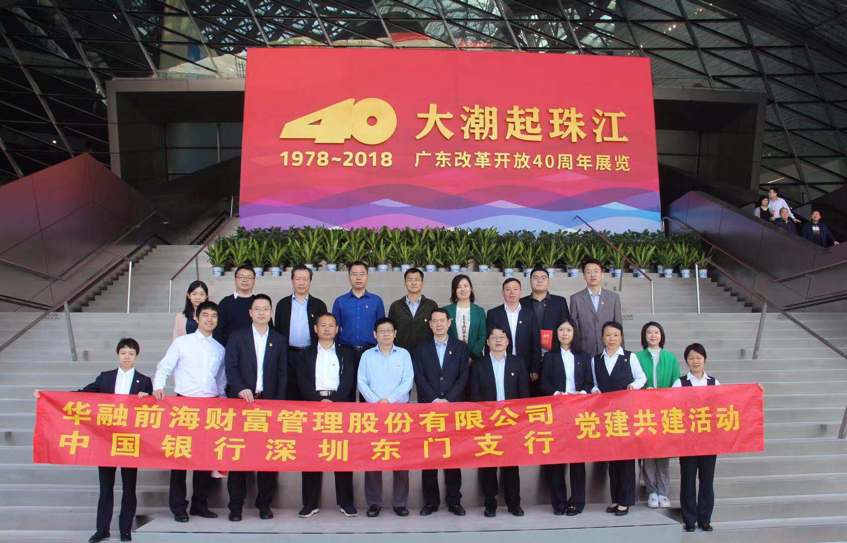 11月29日,中國銀行深圳東門管轄支行轄屬香蜜支行黨支部與華融前海財富管理股份有限公司黨委會開展黨建共建活動,共同組織雙方黨員參觀“大潮起珠江”廣東改革開放40周年展覽館。