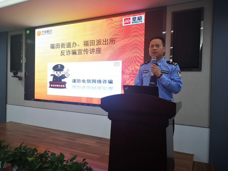 深圳新聞網(wǎng)訊 近年來(lái),信息詐騙案件多發(fā),詐騙分子手段層出不窮,不僅給廣大市民造成了財(cái)產(chǎn)損失,更加將社會(huì)的反詐騙宣傳教育工作推向重要位置。為了普及廣大金融消費(fèi)者的反詐騙知識(shí),同時(shí)讓知識(shí)宣傳更接地氣,近日,寧波銀行深圳分行攜手深圳福田街道辦、福田派出所對(duì)皇庭中心大廈100多位商戶代表,開(kāi)展了一場(chǎng)教育意義深刻的反詐騙知識(shí)講座。福田區(qū)副所長(zhǎng)羅躍、福田派出所社區(qū)隊(duì)隊(duì)長(zhǎng)莫予寶、福田街道辦政法辦主任馬建忠、皇庭物業(yè)總經(jīng)理吳海兵、寧波銀行深圳分行監(jiān)察保衛(wèi)部副總經(jīng)理陳久桐等9位警銀領(lǐng)導(dǎo)代表出席了本次活動(dòng)。