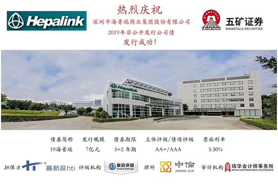 據(jù)悉,此次私募債券“19海普瑞”發(fā)行規(guī)模為7億元,期限3+2年,票面利率5.5%。在深圳高新投的助力下,債券募集過程中,得到了各大金融機構的踴躍認購,獲得2倍超額認購額,5.5%的票面利率也創(chuàng)下近期AA+民營企業(yè)發(fā)債利率新低。