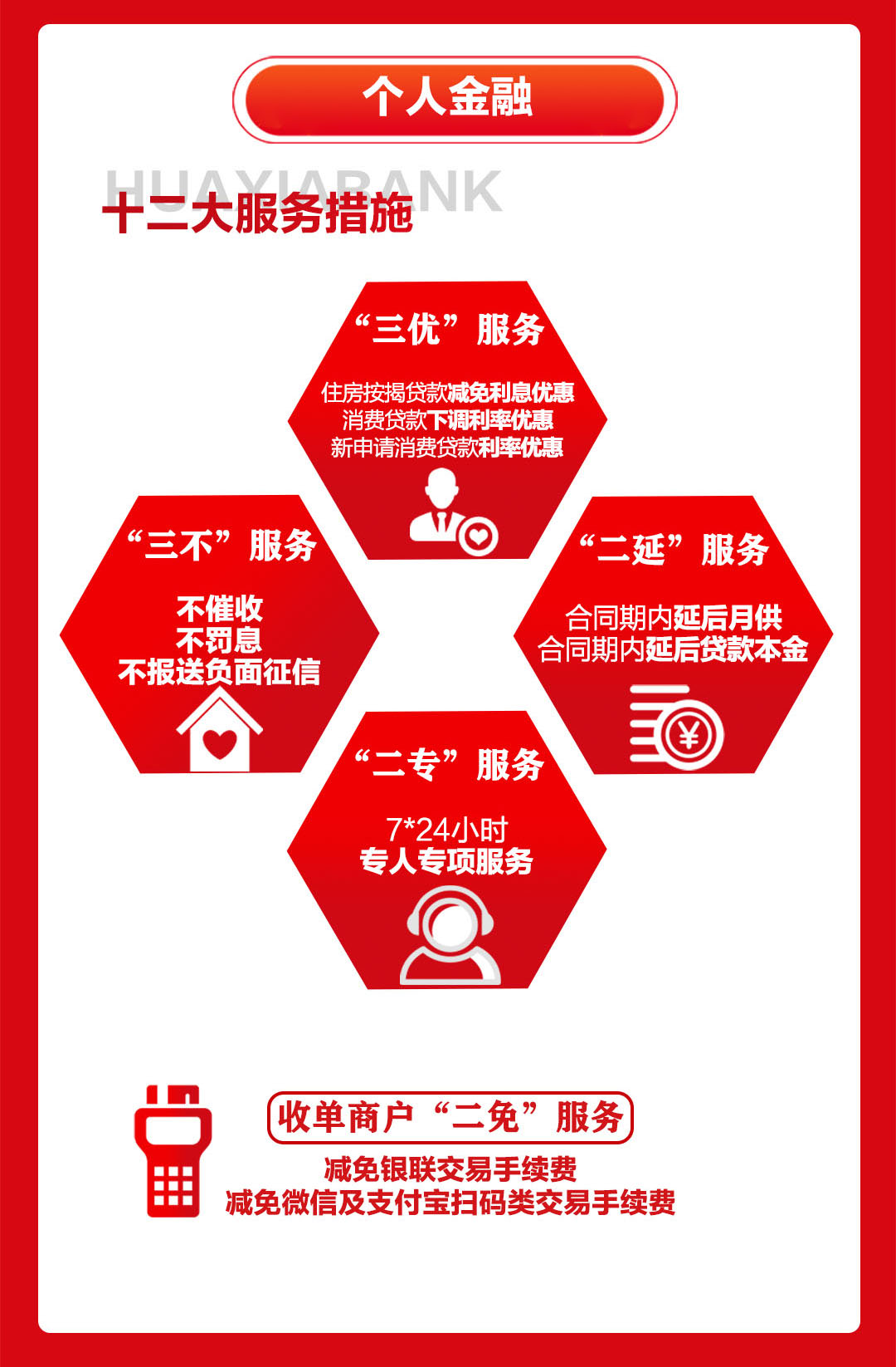 5、收單商戶“二免”:減免銀聯(lián)交易手續(xù)費,減免微信及支付寶掃碼類交易手續(xù)費。疫情防控期間,從事抗擊疫情相關行業(yè)的華夏銀行深圳分行收單商戶(醫(yī)院、藥店、受理捐贈的慈善機構),將減免交易手續(xù)費;小微收單商戶,將減免銀聯(lián)二維碼交易手續(xù)費。在政府解除疫情警報后三個月內(nèi),個體類收單商戶,將在一定額度內(nèi)減免銀聯(lián)交易手續(xù)費;在此期間新申請成為個體類收單商戶的,可享受微信及支付寶掃碼類交易手續(xù)費減免優(yōu)惠。