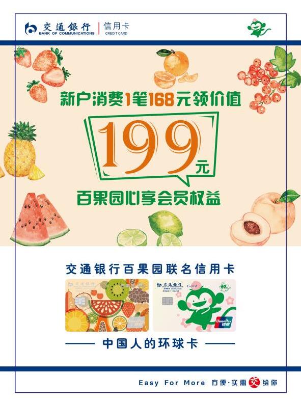 即日起至2020年12月31日,成功核發(fā)指定交通銀行百果園聯(lián)名信用卡主卡的新客戶,自核卡日起45天(含)內(nèi)使用該指定交通銀行信用卡滿足1筆單筆為168元(含)以上的消費(fèi)(不含取現(xiàn)、轉(zhuǎn)賬),即可于核卡日60天內(nèi)(含)至買單吧APP使用5積分換購(gòu)價(jià)值199元的百果心享會(huì)員權(quán)益。