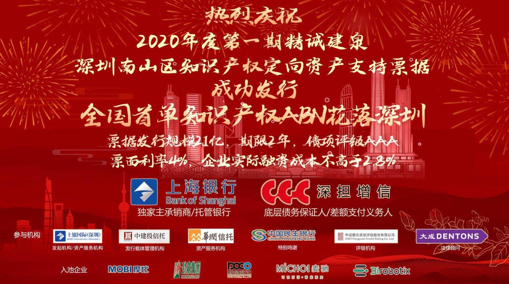 深圳新聞網(wǎng)·見圳客戶端2020年9月23日訊 昨日,隨著上海銀行股份有限公司主承的“上銀國際投資(深圳)有限公司2020年度第一期精誠建泉深圳南山區(qū)知識產權定向資產支持票據(jù)”成功發(fā)行,中國銀行間交易商協(xié)會首單民營科技中小企業(yè)專項知識產權ABN項目花落深圳。該項目不僅是對知識產權證券化的一次創(chuàng)新和實踐,也為中小民營科技企業(yè)開辟了一條在銀行間市場融資的新渠道。本期ABN共五家入池企業(yè),發(fā)行規(guī)模2.1億元,期限兩年,票面4%,經南山區(qū)政府補貼和深圳擔保集團費用減免,入池企業(yè)實際融資成本低于年化2.80%。 一直以來,上海銀行以“精誠至上,信義立行”為核心價值觀,堅持“融智”與“融資”有機結合,以實體經濟需求為導向,不斷推進產品創(chuàng)新,持續(xù)為實體經濟發(fā)展提供更高質量、更有效率的金融服務。此次首單知識產權ABN項目花落深圳,不僅是深圳不斷強化金融創(chuàng)新所取得的重要成果,更是上海銀行探索服務深圳、服務實體經濟新模式的重要實踐。