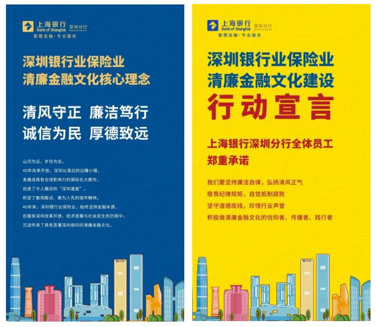 5月以來,上海銀行深圳分行按照深圳銀保監(jiān)局、深圳銀行業(yè)協(xié)會(huì)指導(dǎo)要求,秉持聯(lián)合性、統(tǒng)一性、持續(xù)性原則,統(tǒng)一啟動(dòng)宣教行動(dòng)日,在線上、線下等宣傳陣地多樣化宣傳標(biāo)志性統(tǒng)一宣教文案,形成強(qiáng)烈的清廉金融文化宣教主題,營造濃厚宣教氛圍。統(tǒng)一在分行內(nèi)部電梯間LED屏、餐廳電視屏、各網(wǎng)點(diǎn)電視顯示屏等載體上投放清廉金融文化宣教視頻;統(tǒng)一在網(wǎng)點(diǎn)走馬燈展示“深圳銀行業(yè)保險(xiǎn)業(yè)清廉金融文化核心理念—清風(fēng)守正、廉潔篤行、誠信為民、厚德致遠(yuǎn)”等宣教標(biāo)語;發(fā)布分行自制清廉金融宣教海報(bào),充分加入自身特色理念,融入我行智慧金融,專業(yè)服務(wù)的理念,并組織各單位在公眾號(hào)、微信、朋友圈積極學(xué)習(xí)轉(zhuǎn)發(fā),形成宣教合力。