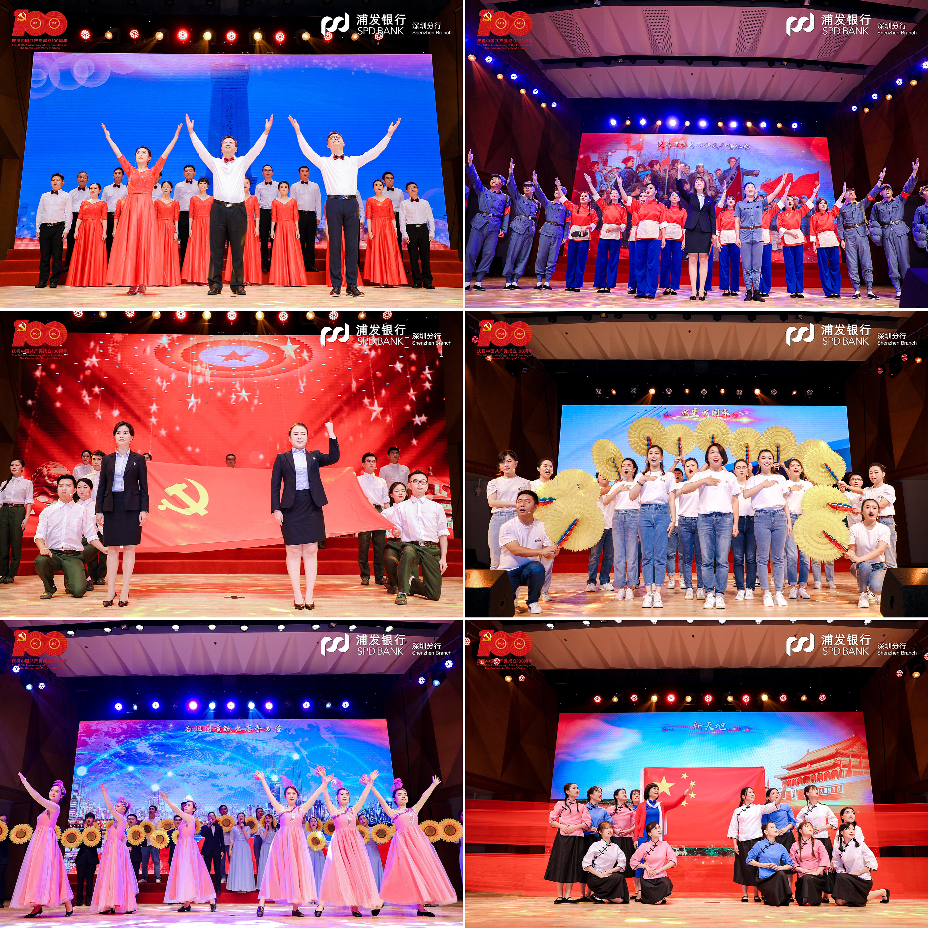 在黨支部風采展示環(huán)節(jié),該行基層黨支部精心編排12首紅色經(jīng)典,通過4個篇章再現(xiàn)百年波瀾壯闊的偉大歷程。第一篇章“開天辟地”演繹了中國共產(chǎn)黨在新民民主義革命時期完成救國大業(yè)的輝煌歷程,《保衛(wèi)黃河》吹響了高亢嘹亮的愛國號角,《十送紅軍》深情演繹血濃于水軍民情,《繡紅旗》一腔熱血帶著大家重回歌樂山。第二篇章“改天換地”回顧了中國共產(chǎn)黨在社會主義革命和建設(shè)時期完成興國大業(yè)的奮斗史詩,《歌唱祖國》撥動人們最難忘的記憶,《我們走在大路上》展現(xiàn)當年敢闖敢拼的奮進之姿態(tài),《唱支山歌給黨聽》唱出人民心中永恒的贊歌。第三篇章“翻天覆地”再現(xiàn)了中國共產(chǎn)黨在改革開放和社會主義現(xiàn)代化建設(shè)新時期推進富國大業(yè)的光榮壯舉,《在燦爛陽光下》重現(xiàn)春風化雨之后的奮斗時光,《國家》打動多少人的赤子之心,《我們的生活充滿陽光》訴說了改革開放背后的喜悅。第四篇章“驚天動地”展現(xiàn)了中國共產(chǎn)黨在中國特色社會主義新時代推進并將在本世紀中葉實現(xiàn)強國大業(yè)的偉大時代,一首《天耀中華》是浦發(fā)人最深沉的表達,《燈火里的中國》讓人漫步燈火漫卷的萬里山河,《再一次出發(fā)》展示浦發(fā)追夢者的雄姿英發(fā)。走過“百年風雨”,浦發(fā)銀行深圳分行合唱團一首《我和我的祖國》,蓬勃朝氣盡顯拳拳愛國心、濃濃赤子情。篇章結(jié)束,大家全體起立,高聲合唱《沒有共產(chǎn)黨就沒有新中國》,以最真摯最熱烈的歌聲獻禮建黨百年。