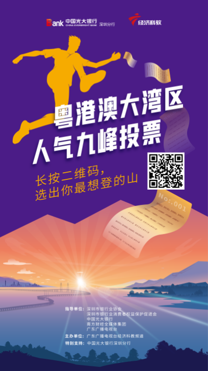 近日,“2021粵港澳大灣區(qū)全民登高系列賽”已經(jīng)進(jìn)入啟動(dòng)階段,現(xiàn)已在網(wǎng)上發(fā)起粵港澳大灣區(qū)人氣九峰的投票,通過(guò)各大網(wǎng)友從29座粵港澳大灣區(qū)山峰中票選出九座人氣最高的山峰,作為本次全民登高系列賽線上賽的主要場(chǎng)地,并在其中一座山峰舉行線下賽事活動(dòng)。廣大市民朋友可通過(guò)掃描圖中二維碼進(jìn)行投票。