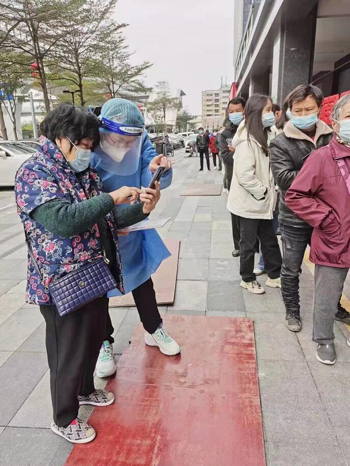 2月17日,景華社區(qū)公園核酸篩查檢測點。面對大量參與核酸檢測的市民,青年志愿者耐心做好指引解釋,指導群眾掃碼、采集信息,教居民操作檢測小程序,開展防疫宣傳,維護現(xiàn)場秩序,保障核酸檢測工作井然有序進行。因核酸檢測點在居民區(qū),老年人較多,對核酸檢測登記小程序操作流程不熟悉,再加上是夜晚檢測,現(xiàn)場光線不足,給服務工作帶來一些難題,但青年志愿者們沒有退縮,而是拿出在工作中服務客戶的勁頭,更細致、更耐心解決問題,做好志愿服務。
