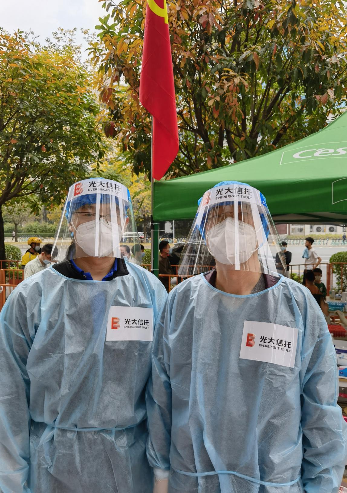 光大信托深圳區(qū)域黨支部在接到協(xié)同抗疫通知后,第一時間組織黨員和員工積極報名參與志愿服務。3月5日,恰逢毛澤東主席“向雷鋒同志學習”題詞的紀念日,光大信托公司風險總監(jiān)姚恒民同志以年近6旬的高齡,率先垂范的沖在一線,帶領深圳區(qū)域黨員同志們,投入福田區(qū)蓮花街道獅嶺社區(qū)的核酸檢測志愿服務工作,用實際行動和赤誠情懷書寫共產(chǎn)黨員的責任和擔當。當天天氣炎熱,太陽暴曬下穿著防護服兩個小時工作下來,全身已完全濕透,但他們以飽滿的激情、負責任的態(tài)度詮釋了一個共產(chǎn)黨員在黨旗下宣誓的誓言。光大信托的一位黨員同志說:“疫情就是命令,防控就是責任,崗位就是戰(zhàn)場,每個服務點的黨旗就是一種信仰,每個黨員就是一面旗幟,每個黨支部就是一個堡壘,哪里有需要,哪里就有光大人的身影?!?/p>