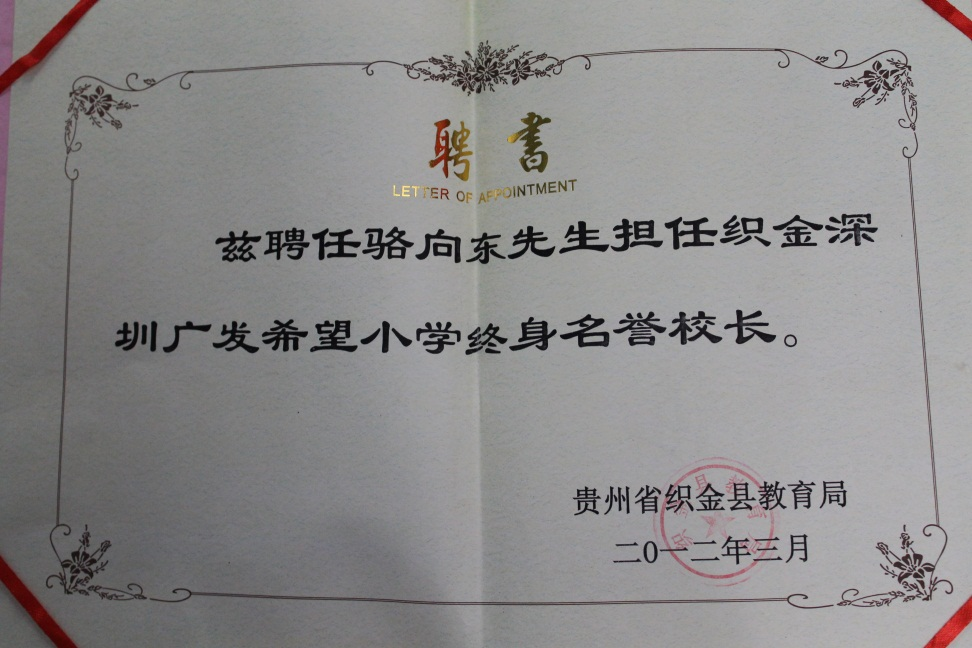 2013年,在駱向東的退休儀式上,織金縣教育局將一張希望小學(xué)終身名譽(yù)校長(zhǎng)的聘書(shū),鄭重交到了他的手上?!拔液軜s幸能代表廣發(fā)銀行深圳分行黨委去推動(dòng)這件事,但公益事業(yè)任重道遠(yuǎn),我相信愛(ài)心基因會(huì)在廣發(fā)一直傳承下去?!笔聦?shí)也正如駱向東所言,從1998年籌建希望小學(xué)至今,一代代廣發(fā)人身體力行,讓愛(ài)心助學(xué)一棒接力一棒。