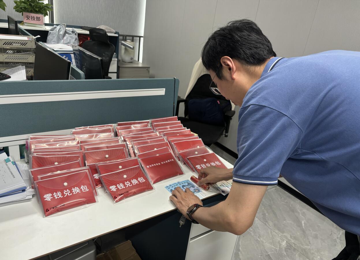 “經常碰到老年人或者外國人打車時給我一百元的大鈔,可我沒有零錢找啊,需要開到路邊等客戶去便利店或商鋪換零錢?,F在廣發(fā)銀行上門來給我換零錢,幫我解決了大問題,可以節(jié)約時間多接幾個單,多賺點錢嘍!”出租車司機李師傅興奮地說道。僅一分鐘,他便兌換好了一個200元的零錢包。