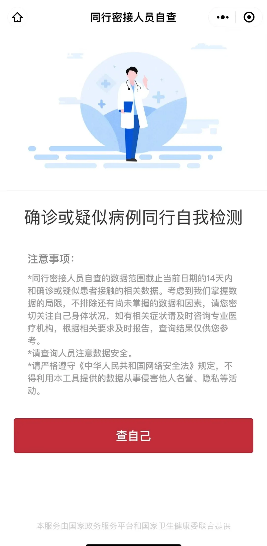 同行自查服務(wù)由國(guó)家政務(wù)服務(wù)平臺(tái)和衛(wèi)健委聯(lián)合提供,14天內(nèi)乘坐過(guò)飛機(jī)或者火車(chē)等公共交通工具出行的市民可掃描下方二維碼進(jìn)行查詢(xún)。