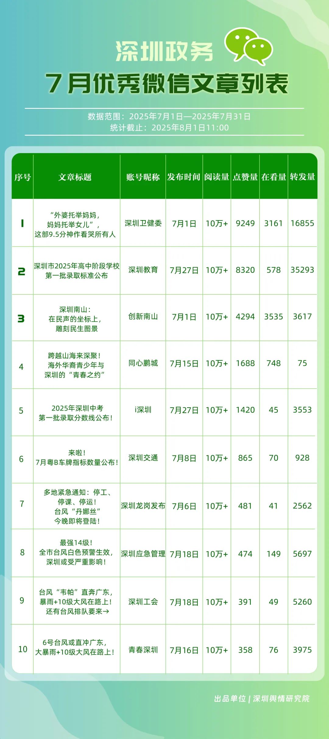 7月,30個(gè)政務(wù)微信公眾號(hào)入選“深圳優(yōu)秀政務(wù)微信公眾號(hào)”榜單,其中包括“深圳衛(wèi)健委”“深圳龍崗發(fā)布”“幸福福田”“創(chuàng)新南山”“i深圳”“深圳教育”“青春深圳”“深圳工會(huì)”“深圳光明”“濱海寶安”等。7月,“深圳衛(wèi)健委”內(nèi)容專業(yè)性與傳播力優(yōu)勢穩(wěn)固,整體表現(xiàn)保持較高水平,位于榜首;“深圳龍崗發(fā)布”聚焦民生服務(wù)與區(qū)域活動(dòng)宣傳,實(shí)現(xiàn)傳播效果提升,位居第二;“幸福福田”表現(xiàn)同樣不俗,排名第三?!皠?chuàng)新南山”“深圳教育”“深圳工會(huì)”等也積極發(fā)布高質(zhì)量信息與服務(wù)內(nèi)容,能夠較好平衡內(nèi)容“質(zhì)”與“量”,排名有所提升。上榜微信公眾號(hào)依托特色優(yōu)勢深耕內(nèi)容創(chuàng)作,將優(yōu)質(zhì)內(nèi)容作為核心支撐,成為政務(wù)傳播領(lǐng)域的優(yōu)秀典范。