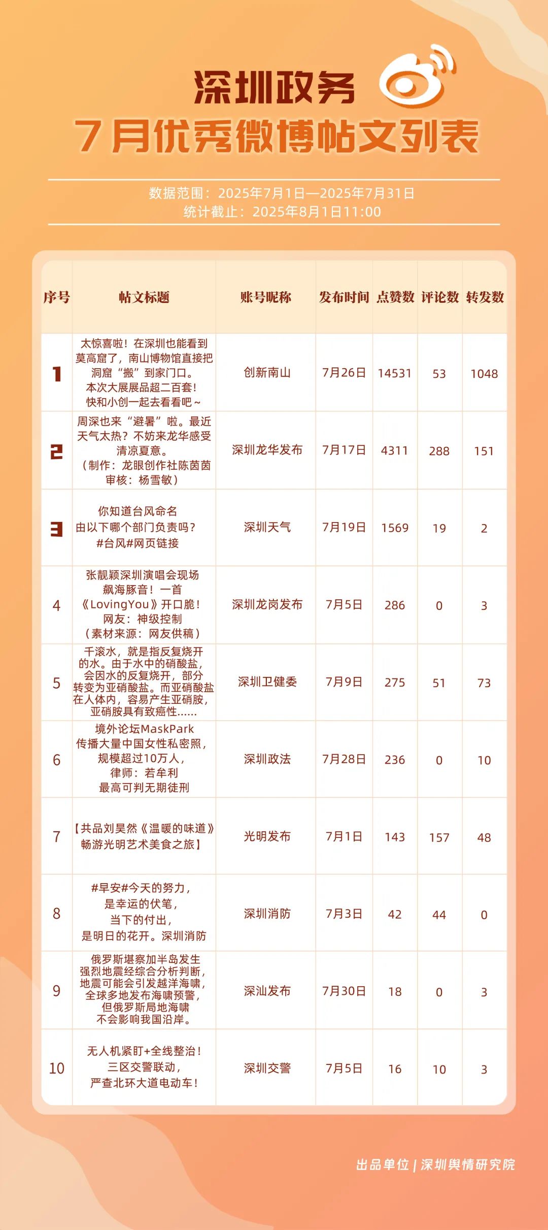 7月,“深圳天氣”“DOU愛龍華”“深圳魅力福田”“深汕發(fā)布”“掌上龍崗”“創(chuàng)新南山”“深圳交警”“文旅深圳”“深圳衛(wèi)健委”“深圳普法”共10個(gè)政務(wù)抖音號(hào)獲得“優(yōu)秀政務(wù)抖音號(hào)”稱號(hào)。其中,“深圳天氣”互動(dòng)指標(biāo)獲滿分,憑借氣象與趣味相結(jié)合的創(chuàng)新科普形式,領(lǐng)跑優(yōu)秀政務(wù)抖音號(hào);“DOU愛龍華”“深圳魅力福田”分別位列第二、三名,通過聚焦網(wǎng)絡(luò)熱點(diǎn)、挖掘創(chuàng)意內(nèi)容,不斷提升傳播效能,展現(xiàn)出強(qiáng)大的政務(wù)新媒體影響力;“深汕發(fā)布”“掌上龍崗”“創(chuàng)新南山”等賬號(hào)緊隨其后,上榜的優(yōu)質(zhì)政務(wù)抖音號(hào)用短視頻語言強(qiáng)化傳播效果,展現(xiàn)了鮮明的賬號(hào)特色和風(fēng)采。