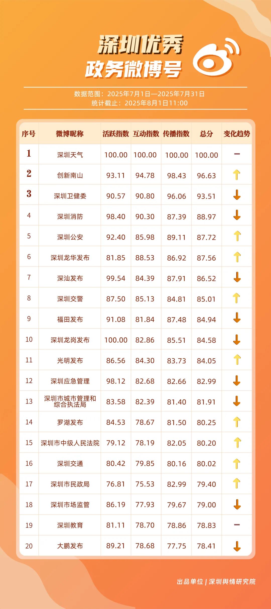 7月,“深圳天氣”“創(chuàng)新南山”“深圳衛(wèi)健委”“深圳消防”“深圳公安”“深圳龍華發(fā)布”“深汕發(fā)布”“深圳交警”“福田發(fā)布”“深圳龍崗發(fā)布”等20個(gè)賬號(hào)入選“優(yōu)秀政務(wù)微博號(hào)”。其中,“深圳天氣”以活躍、互動(dòng)、傳播指數(shù)三項(xiàng)滿分,蟬聯(lián)榜首;“創(chuàng)新南山”以總分96.63躍居第二,排名呈上升趨勢;“深圳衛(wèi)健委”位列第三,評(píng)分也在90分以上,其科普信息持續(xù)獲得市民廣泛認(rèn)可。以上優(yōu)秀的政務(wù)微博賬號(hào)精準(zhǔn)貼合平臺(tái)的傳播規(guī)律,用獨(dú)特的賬號(hào)風(fēng)格展現(xiàn)各自特色與魅力。