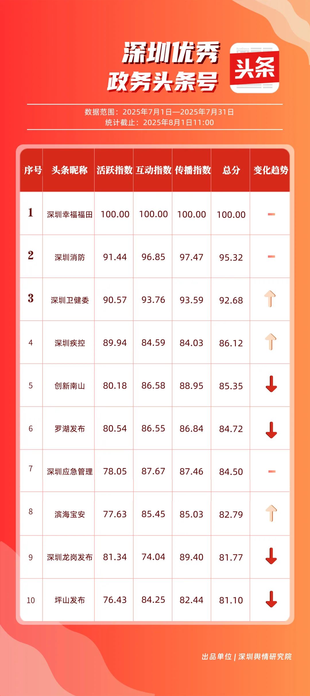 7月,“深圳幸福福田”“深圳消防”“深圳衛(wèi)健委”“深圳疾控”“創(chuàng)新南山”“羅湖發(fā)布”“深圳應(yīng)急管理”“濱海寶安”“深圳龍崗發(fā)布”“坪山發(fā)布”共10個(gè)政務(wù)頭條號(hào)入選“優(yōu)秀政務(wù)頭條號(hào)”榜單?!吧钲谛腋8L铩薄吧钲谙馈睉{借優(yōu)質(zhì)內(nèi)容持續(xù)吸引用戶關(guān)注,穩(wěn)居前二;“深圳衛(wèi)健委”表現(xiàn)亮眼,評(píng)分達(dá)92.68分,排名較6月有所上升;“深圳疾控”同樣進(jìn)步明顯,在疾病預(yù)防控制信息傳播上發(fā)揮了重要作用?!皠?chuàng)新南山”“羅湖發(fā)布”“深圳應(yīng)急管理”等上榜賬號(hào),也各展所長,始終將優(yōu)質(zhì)內(nèi)容作為核心抓手,成為政務(wù)新媒體領(lǐng)域內(nèi)容創(chuàng)作與傳播的典范。