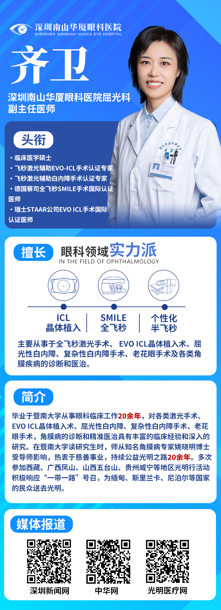畢業(yè)于暨南大學(xué)的齊衛(wèi)主任,師從知名角膜病專家姚曉明博士,從求學(xué)時(shí)起就對眼科事業(yè)的熱愛。臨床工作中,而且她在激光手術(shù)、EVO ICL 晶體植入術(shù)、屈光性白內(nèi)障手術(shù)等領(lǐng)域積累了深厚造詣。