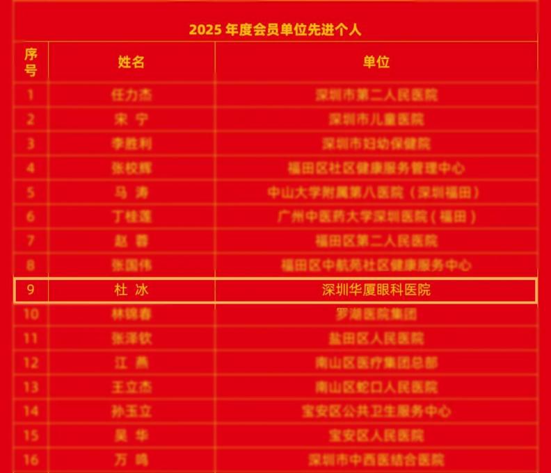 深圳新聞網(wǎng)2026年1月29日訊(記者 林恒鑫)1月27日,深圳市社區(qū)衛(wèi)生協(xié)會公布了2025年度優(yōu)秀分支機構(gòu)及先進個人名單,深圳華廈眼科醫(yī)院副院長杜冰教授因在社康眼健康服務中的突出表現(xiàn),榮獲“2025年度會員單位先進個人”稱號。