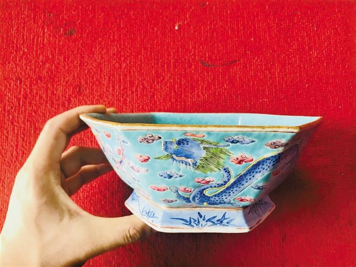 ▲清同治粉彩龍紋綠地六方果盤。吳冠甫 攝