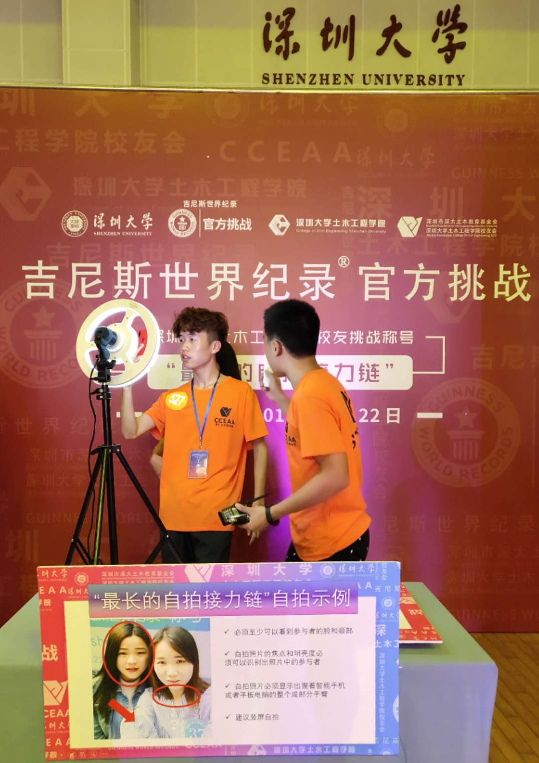 深圳新聞網訊 9月22日下午3點,深圳大學土木工程學院千名師生、校友齊聚深圳大學元平體育館,成功創(chuàng)造“最長的自拍鏈條”吉尼斯世界紀錄 TM 稱號。