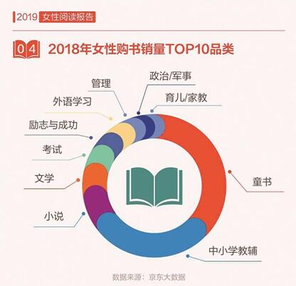 京東大數(shù)據(jù)顯示,女性的讀書量顯著提升,2018年,女性讀者人均購書7.6本,高于男性,女性讀者在紙質(zhì)書購買上的人均消費近230元,女性的“閱讀力”正在變得越來越強(qiáng)。從圖書銷量上看,2018年女性讀者購買最多的圖書是童書、中小學(xué)教輔、小說、文學(xué)和考試,可見對于大部分女性而言,購書的主要目的是出于育兒的需求。