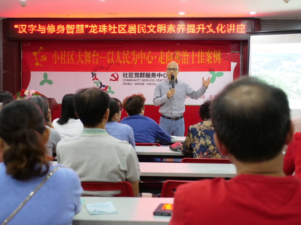 深圳新聞網(wǎng)訊 為更好地創(chuàng)建第六屆全國文明城市,以創(chuàng)新的活動形式提升社區(qū)居民的文明素養(yǎng),11月15日上午,龍珠社區(qū)舉行了“‘漢字與修身智慧’社區(qū)居民文明素養(yǎng)提升”專題文化講座,邀請壹讀書會創(chuàng)始人、知名閱讀推廣人、《漢字與修身智慧》的作者劉建彪擔任主講嘉賓,從中華文明的基因(漢字)出發(fā),解讀深圳市民公約,旨在啟發(fā)居民在中華優(yōu)秀傳統(tǒng)文化的感召之下,踐行文明禮儀,用實際行動去推進文明城市的創(chuàng)建。