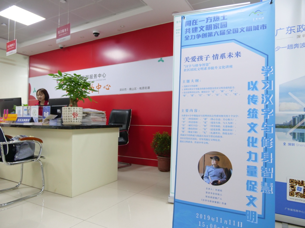 11月11日下午,本系列活動(dòng)的第三場講座在平山社區(qū)工作站拉開了序幕,此次講座由桃源街道黨工委(辦事處)主辦、深圳市壹書文化傳播有限責(zé)任公司承辦、平山社區(qū)黨委協(xié)辦。從2005年起,深圳連續(xù)五次獲得“全國文明城市”的榮譽(yù)稱號,在爭創(chuàng)第六屆全國文明城市的關(guān)鍵時(shí)期,桃源街道辦積極響應(yīng)市委市政府的號召,堅(jiān)持求真務(wù)實(shí)的工作作風(fēng),以“‘同在一方熱土共建文明家園’——全力爭創(chuàng)第六屆全國文明城市”為文明創(chuàng)建標(biāo)語,開展題為“學(xué)習(xí)漢字與修身智慧,以傳統(tǒng)文化力量促文明”的文化講座,為創(chuàng)建文明城市貢獻(xiàn)一份力量。