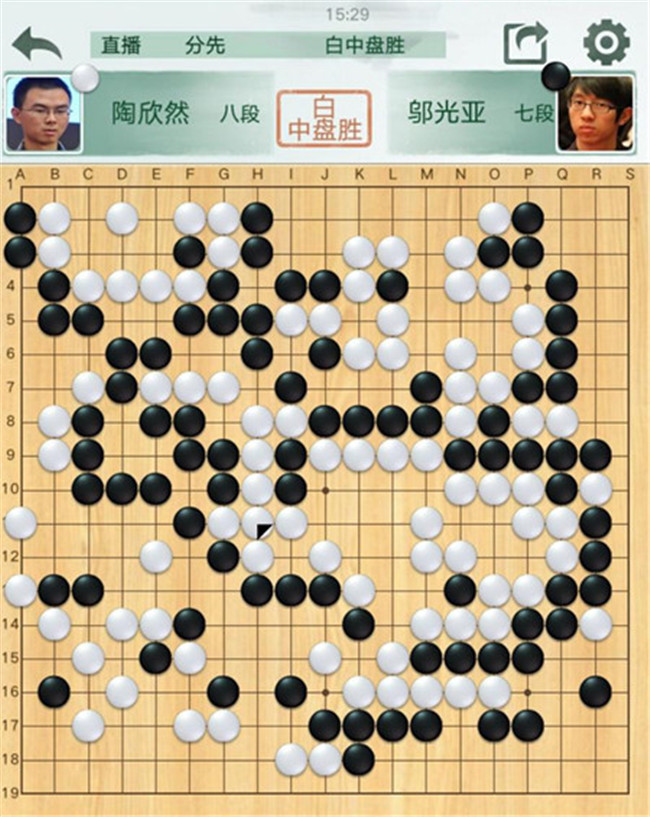 陶欣然執(zhí)白對(duì)陣鄔光亞。黑棋右邊攻擊白棋時(shí)候,連續(xù)失誤,反被白棋妙手吃通棋筋,黑已無(wú)法逆轉(zhuǎn)局面。有意思的是,賽前陶欣然遲到2分鐘被罰2分鐘,但絲毫不影響他獲勝。