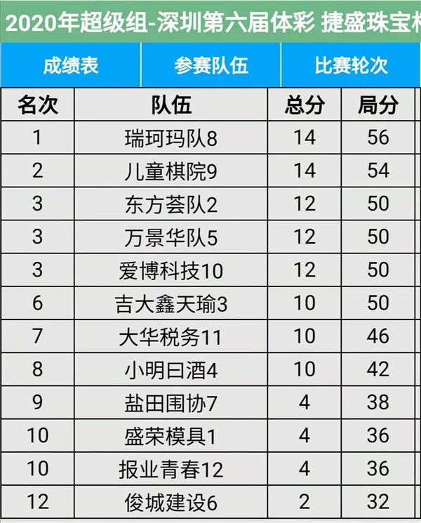 見圳客戶端?深圳新聞網(wǎng)2020年11月15日訊(記者周錦春)第六屆“體彩?捷盛珠寶杯”深圳市圍棋聯(lián)賽繼續(xù)在羅湖區(qū)藝嘉大酒店展開,今天是第三場,有第7輪至第9輪的比賽。目前,超級組中,瑞珂瑪隊、兒童棋院隊在積分榜上排名第一第二,繼續(xù)領(lǐng)先;甲級組中,奇力電子、深圳大學(xué)在積分榜上排名第一第二。具體賽程結(jié)果請看本文附后表格。