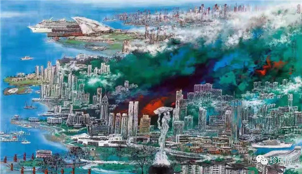 宋玉明從金陵畫派的新傳統(tǒng)跨越到城市表現(xiàn)的積彩拓墨畫法,既體現(xiàn)了現(xiàn)代化城市對(duì)于變革傳統(tǒng)的時(shí)代訴求,也體現(xiàn)了他移居深圳后這座新興城市文化對(duì)于他的深刻影響。畢竟,連續(xù)數(shù)屆的深圳水墨雙年展對(duì)于水墨在跨文化中重要作用與表現(xiàn)方法的突破,都給予他至深的思想開拓。這表明,城市山水畫已不單純是用中國(guó)畫表現(xiàn)城市的命題,而是其中能夠蘊(yùn)含多少城市文化觀念與城市審美的方法,宋玉明對(duì)于城市山水畫的探索,體現(xiàn)的正是這樣一種對(duì)城市現(xiàn)代文化的思想融合性。而不拘謹(jǐn)于城市一磚一石、一街一道、一房一樓的描繪,著眼于發(fā)揮水墨與彩墨表現(xiàn)的自由性,抑或體現(xiàn)了人性、自然與現(xiàn)代城市共同作用的現(xiàn)代生活方式與人文理想。的確,純粹用中國(guó)畫或水墨畫來(lái)探索城市的現(xiàn)代化景觀表現(xiàn),也許只是淺層次的審美需求;而只有當(dāng)把山水畫作為人與自然和諧統(tǒng)一的觀念表達(dá)植入城市現(xiàn)代化的審美訴求時(shí),城市山水畫才能真正凸顯出其深刻的美學(xué)價(jià)值。這正是我們從宋玉明的作品里能夠讀解到的他對(duì)于城市山水畫審美理想的一種勾畫。