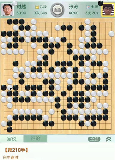 時(shí)越快棋執(zhí)白對(duì)陣張濤。右邊作戰(zhàn)時(shí)候,黑棋沒有選擇造劫劫爭(zhēng)而是退讓,被白將右邊幾子吃掉后又吃掉右上黑棋,黑棋局面落后。之后黑棋右下又死活看錯(cuò)被白先手活出,導(dǎo)致雪上加霜,實(shí)際上棋局已經(jīng)結(jié)束。