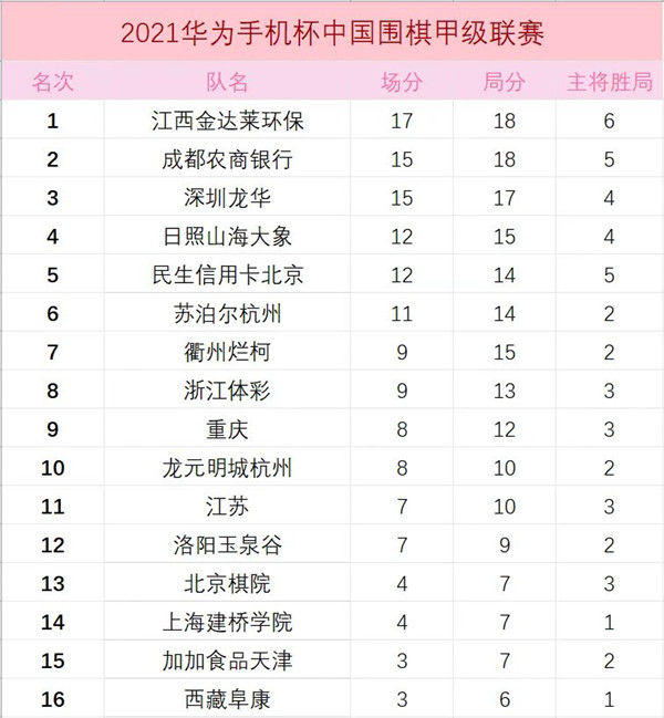 見圳客戶端?深圳新聞網(wǎng)2021年6月7日訊(記者周錦春)華為手機杯男子圍甲聯(lián)賽在浙江長興重燃戰(zhàn)火, 深圳龍華隊1:3不敵日照山海大象隊跌落榜首,排名被江西和成都超越降至第三位。上屆冠軍江西金達萊環(huán)保隊本階段首輪繼續(xù)保持勝勢,3比1擊敗北京棋院隊,金身不敗豪取6連勝,并登上積分榜首位。
